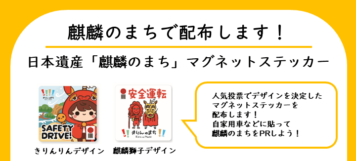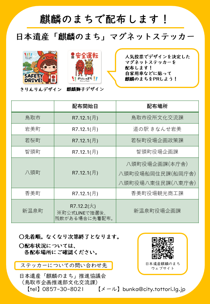 日本遺産「麒麟のまち」インフォメーション 日本遺産「麒麟のまち」に関連する取組みについてご紹介します!日本遺産とは? 詳しくはこちら日本遺産「麒麟のまち」ウェブサイトトップページへ戻る 目次 「麒麟のまち」交通安全マグネットステッカーを配布します! 日本遺産「麒麟のまち」、日本遺産認定継続となりました! 「ガチャっとまわろう!麒麟のまちフォトラリー」開催中! 日本遺産を知ろう! 麒麟獅子舞体感イベント 日本遺産・麒麟獅子舞巡回展 日本遺産・麒麟獅子ラッピングタクシー「PEACE CAB」 「麒麟のまち」交通安全マグネットステッカーを配布します! 2025年10月20日から11月5日にかけて実施した人気投票で決定したデザインの日本遺産「麒麟のまち」交通安全マグネットステッカーを、麒麟のまち圏域で配布します!計2,000枚の在庫枚数がなくなり次第終了します。配布状況は、各配布場所にご確認ください。自治体名配布開始日配布場所鳥取市2025年12月1日(月)鳥取市役所文化交流課岩美町2025年12月1日(月)道の駅 きなんせ岩美若桜町2025年12月1日(月)若桜町役場企画政策課智頭町2025年12月1日(月)智頭町役場企画課八頭町2025年12月1日(月)八頭町役場企画課(本庁舎)八頭町役場船岡住民課(船岡庁舎)八頭町役場八東住民課(八東庁舎)香美町2025年12月1日(月)香美町役場観光商工課新温泉町2025年12月2日(火)※新温泉町役場企画課※町公式LINEで抽選(抽選受付:11/21(金)~11/30(日))。残数がある場合のみ先着配布を実施。 関連資料 日本遺産麒麟のまちステッカーの配布について 日本遺産「麒麟のまち」、日本遺産認定継続となりました! 麒麟のまち圏域の日本遺産『日本海の風が生んだ絶景と秘境―幸せを呼ぶ霊獣・麒麟が舞う大地「因幡・但馬」』は、日本遺産審査・評価委員会による認定継続審査の結果、認定継続となりました!引き続き日本遺産「麒麟のまち」の魅力を皆様に知ってもらえるよう活動を続けていきますので、今後とも 日本遺産「麒麟のまち」をどうぞよろしくお願いいたします! 「ガチャっとまわろう!麒麟のまちフォトラリー」開催中! 麒麟のまち圏域の各聖地を巡るフォトラリーを開催中!各聖地の写真をInstagramに投稿し、周遊ポイントを集めよう!すべての聖地を周遊すると最大4万円相当の麒麟のまち圏域の魅力が体感できる景品がもらえるチャンスも!【募集期間】2025年8月1日(金)~12月31日(水)24時まで キャンペーン公式サイト キャンペーン公式Instagram 日本遺産を知ろう! 麒麟獅子舞体感イベント 麒麟のまち圏域の観光施設や日本遺産の構成文化財施設において、麒麟獅子舞の上演を実施します!2025年の日程はこちら!日時会場保存団体16月14日(土) 14時~石谷家住宅(智頭町)芦津獅子舞保存会26月21日(土)北前船寄港地まつり諸寄漁港(新温泉町)但馬地域麒麟獅子舞保存会37月5日(土) 11時~鳥取砂丘ビジターセンター(鳥取市)因幡麒麟獅子舞の会49月7日(日) 11時~道の駅 きなんせ岩美(岩美町)浦富麒麟獅子舞保存会59月23日(火祝)但馬麒麟獅子舞フェスタ2025新温泉町文化体育館 夢ホール(新温泉町)但馬地域麒麟獅子舞保存会610月19日(日)八頭町マルシェ2025八東総合運動公園(八頭町)米岡神社麒麟獅子舞保存会711月15日(土)11時〜石谷家住宅(智頭町)芦津獅子舞保存会811月22日(土) 11時~鳥取砂丘ビジターセンター(鳥取市)因幡麒麟獅子舞の会911月下旬〜12月上旬頃若桜宿内(若桜町)若桜神社麒麟獅子舞保存会 国指定重要文化財 石谷家住宅 江戸時代から300年以上続く商家である石谷家。林業で財を成した石谷家が、国内の銘木、最高の施工技術で建築した「石谷家住宅」は、重厚な大門、3,000坪という広大な敷地、部屋数が40以上ある邸宅、7棟の蔵、そして美しい日… もっと見る 山陰海岸国立公園 鳥取砂丘ビジターセンター 鳥取砂丘ビジターセンターには、鳥取砂丘が有する魅力をあますところなく伝える展示や映像がたくさんあります。観光案内にも対応するほか、砂丘をよく知るガイドが常駐している今までにない施設です。自然の造形としての砂丘… もっと見る 道の駅 きなんせ岩美 「きなんせ」とは鳥取弁でおいでくださいの意味。海、山の魅力がたくさん詰まった岩美町に多くの方に来て欲しい、そんな願いが込められています。道の駅「きなんせ岩美」では、全国に誇る松葉がにや定置網でとれた新鮮な水産… もっと見る 若桜宿 若桜宿はかつて、若桜鬼ヶ城の城下町として整備され、江戸時代以降は鳥取と姫路を結ぶ若桜街道と伊勢道の宿場町、商業都市として発展しました。しかし明治の大火で若桜宿のほとんどが焼き尽くされてしまい、これにより地… もっと見る 八東総合運動公園 「道の駅はっとう」に隣接しており、眺めの良い開放的な敷地で子どもから大人までのびのび遊べる運動公園です。野球場と全天候型の屋根付き多目的広場もあり、ゲートボールコート、テニスコートでは雨の日でもプレーできます… もっと見る 日本遺産・麒麟獅子舞巡回展 麒麟のまちの日本遺産認定ストーリー「日本海の風が生んだ絶景