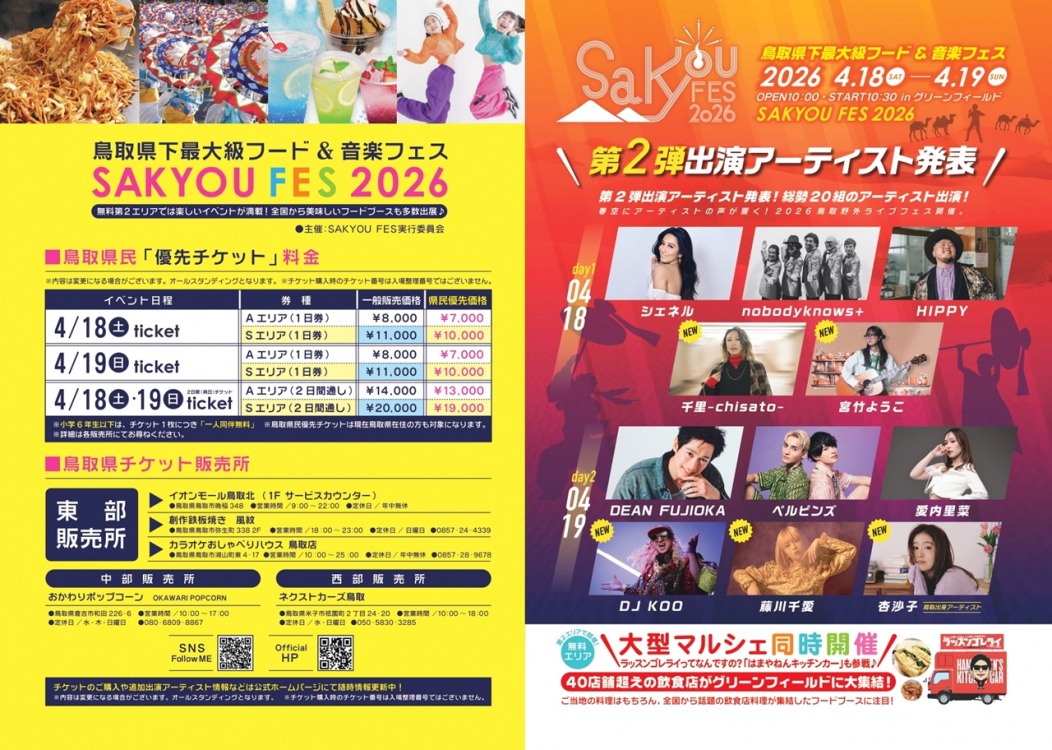 鳥取県下最大級 フード&音楽フェス「SAKYOU FES 2026」の『このへん共和国国民限定価格販売』チケットのご購入ページです。