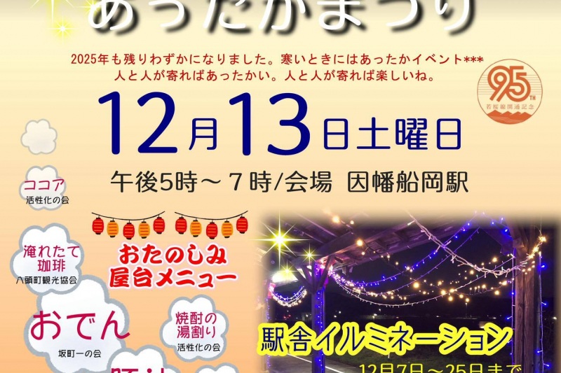【2025】八頭町イルミネーションスポット 鳥取県八頭町各所のイルミネーションについてご紹介!八頭町には八頭町の玄関口「郡家駅」や登録有形文化財である「因幡船岡駅」「隼駅」「丹比駅」などの若桜鉄道の駅舎、大江ノ郷リゾートのイルミネーションなど綺麗なスポットがいっぱいあります!また、イルミネーションに関連したイベント「ぷらっとぴあ・やず イルミネーションコンサート」や「因幡船岡駅あったかまつり」についでもご紹介します。八頭町にお越しの際は是非お立ち寄りください。 目次 郡家駅 因幡船岡駅 2025因幡船岡駅あったかまつり 大江ノ郷ヴィレッジ 大江ノ郷自然牧場 期間限定「ショートケーキパンケーキ」 隼駅 丹比駅 郡家駅 期間:12月6日(土)~2026年1月上旬JR郡家駅構内の「ぷらっとぴあ・やず」は、八頭町観光協会が管理・運営する八頭町観光の拠点です。八頭町の観光案内からオリジナル八頭町グッズの販売、若桜町と八頭町をまたがる「若桜鉄道」グッズ、乗車券の販売など、八頭町に来たらまずはぷらっとお立ち寄りいただきたいスポットです。二階の展望スペース『うさぎテラス』では、『八頭の白兎伝説』の事を知り体感できます。 因幡船岡駅 期間:12月7日(日)~25日(木)因幡船岡駅は、登録有形文化財に登録されています。一年を通して地域住民の団体である「坂町一の会」や「若桜鉄道因幡船岡駅の活性化を考える会 」がイベントを開催しています。木造平屋建の本屋に、プラットホームが一体となって連続する駅です。イルミネーション点灯式は、12月13日(土)17時から因幡船岡駅あったかまつりのイベント内で行います。 2025因幡船岡駅あったかまつり 詳細ページへ 大江ノ郷ヴィレッジ 期間:12月25日(木)までパンを焼く職人、目の前でスイーツを作り上げるパティシエ、銅鍋を振ってだし巻きを焼く姿。作り手の顔が見えるよう、ガラス張りになった開放的な店内は、ものづくりの臨場感にあふれています。お子様やご家族、お友達同士で楽しく学べる体験教室では、バウムクーヘンづくりやソーセージづくり、手打ちうどんなどワクワク・ドキドキがいっぱい。体験を通じて、農業やもの作りの楽しさ、食の大切さを学ぶことができます。2024年11月新たに大江ノ郷ヴィレッジ内にCIEL CRAFT CHOCOLATE TOTTORI(外部リンク)がオープンしました。 詳細ページへ 大江ノ郷自然牧場 期間限定「ショートケーキパンケーキ」 隼駅 期間:12月14日(日)~12月27日(土)予定若桜鉄道隼駅は「若桜鉄道隼駅本屋及びプラットホーム」として登録有形文化財に登録されています。隼駅は木造平屋建の本屋の北側に、プラットホームが連続する駅です。昭和3年以降、昭和5年に若桜駅までの全線が開通する間の終着駅であったため、本屋のほかにも乗務員休憩所など、他の駅では見られない建物が設けられています。外観だけでなく、待合室内部も当時の姿を良く残しています。★こちらもあわせてどうぞ!「隼駅まつり」 丹比駅 期間:2026年1月11日(日)までプラットホームに、アメリカの鉄鋼王として有名なカーネギー製のレールを再利用して作られた庇(ひさし)が特徴的な駅です。現在でもカーネギーの文字を確認することができます。丹比駅舎内では、八東ふるさとの森で見ることのできる野鳥の写真を展示しています。 人気記事ランキング 砂の国でごほうび旅!宿泊3,000円割引+美術館チケット付き☆鳥取市宿泊キャンペーン 詳細はこちら 初めての鳥取砂丘!事前に知っておきたい砂丘攻略法 詳細はこちら 「松葉ガニ」は「ズワイガニ」?鳥取市で食べるべき絶品極上のカニとは 詳細はこちら JR鳥取駅・鳥取空港~鳥取砂丘へのアクセス 詳細はこちら 鳥取駅周辺グルメ情報 詳細はこちら