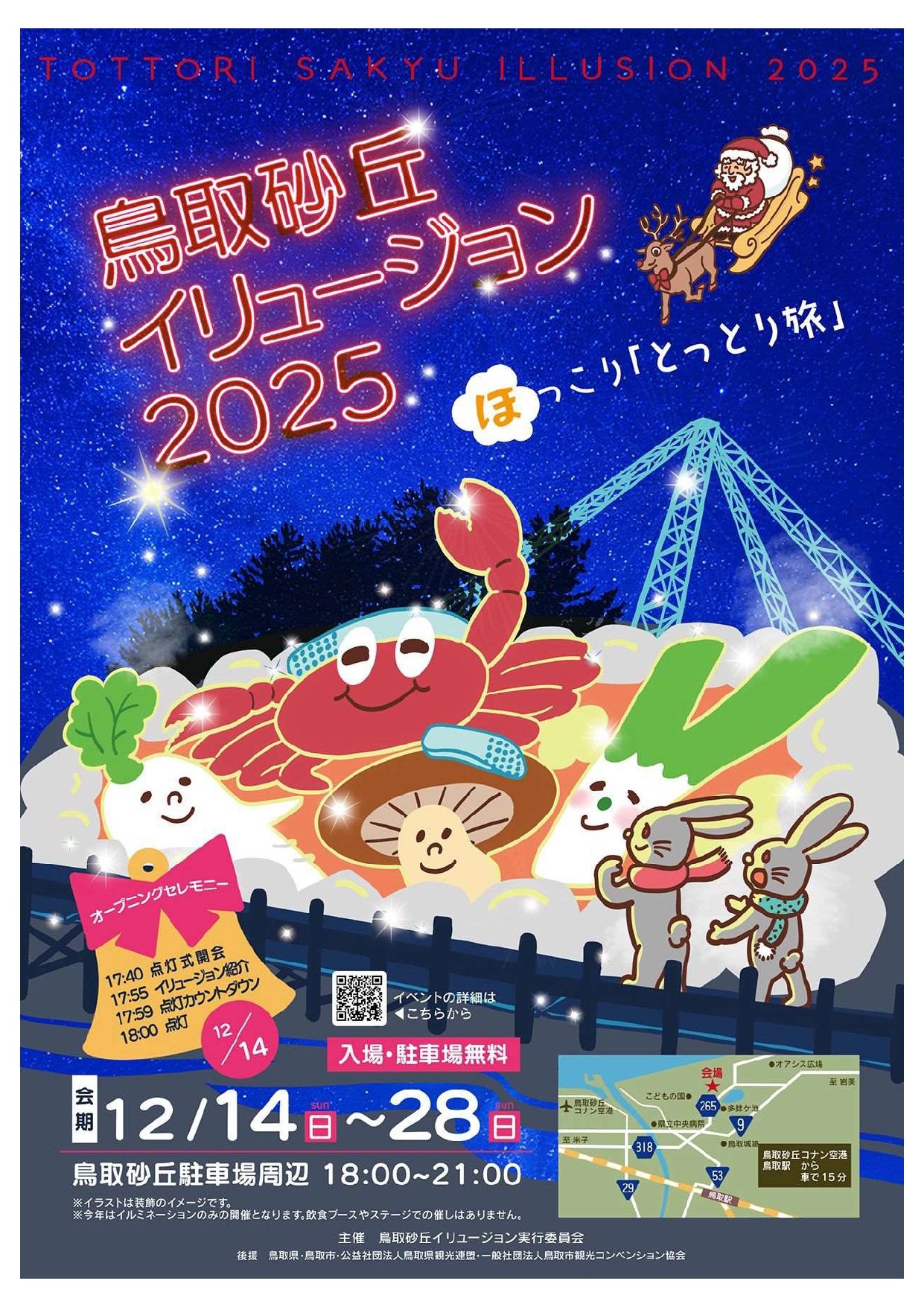 鳥取砂丘という唯一無二の自然舞台をキャンバスに、鳥取の特産品などの「食」をイルミネーションで表現します。訪れる人々が非日常の世界で、家族や大切な人との心あたたまる「ほっこり」とした時間を過ごせることを目指します。イルミネーションに彩られた幻想的な鳥取砂丘で、素敵なクリスマスシーズンをお楽しみください。