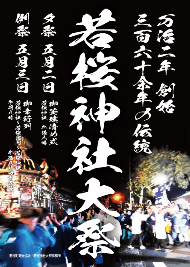 若桜神社大祭は、万治2年(1659年)、因幡藩主池田光仲公より三面の能面が寄進され、御幸祭が許されたことに始まり、今日まで引き継がれてきた、360年以上の伝統を誇る祭りです。