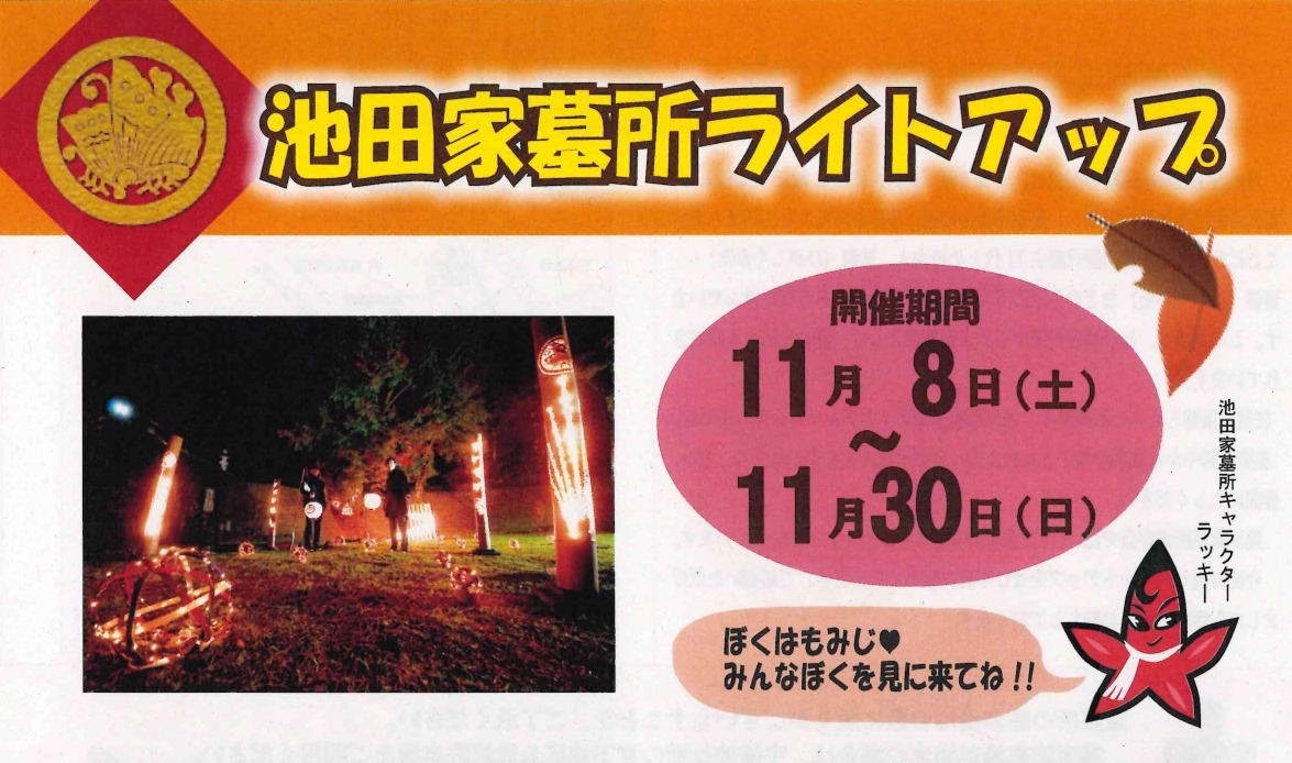 紅葉が美しい時期に池田家墓所のライトアップを行います。また、ライトアップ期間中の11月8日に、第22回燈籠会を行います。昼間の鮮やかな紅葉とは違った表情を見せる夜の墓所にぜひお越しください。