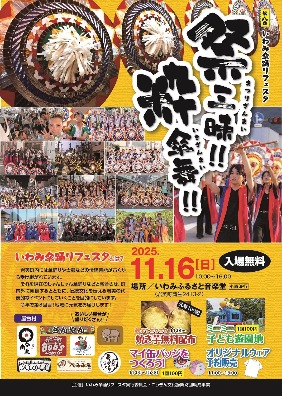 岩美町内には傘踊りや太鼓などの伝統芸能が古くから受け継がれています。それらを現在のしゃんしゃん傘踊りなどと融合させ、町内外に発信するとともに、岩美の伝統文化を伝える岩美の代表的なイベントにしていくことを目標としています。