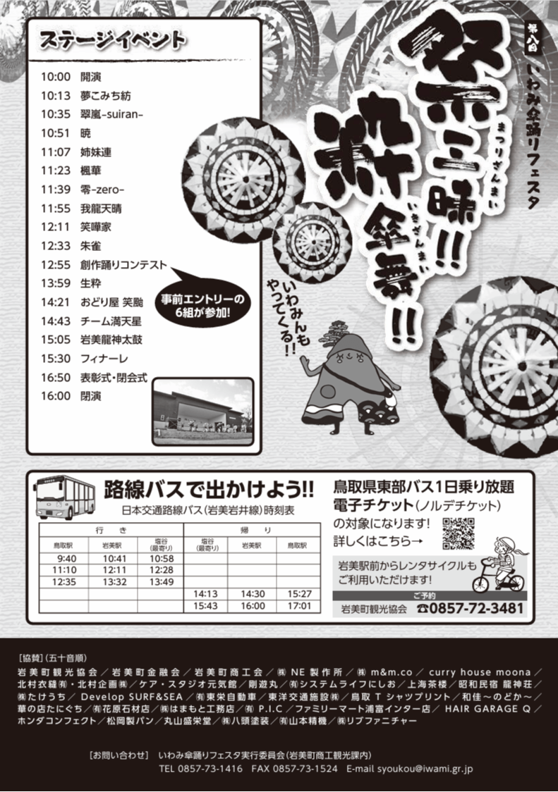 - 0857-73-1416(いわみ傘踊りフェスタ実行委員会(事務局:岩美町役場商工観光課))