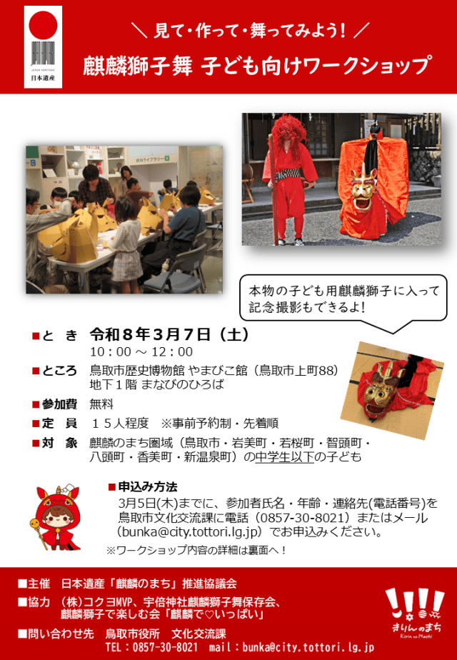 参加希望は、<参加者氏名・年齢・電話番号>を鳥取市文化交流課までご連絡ください。