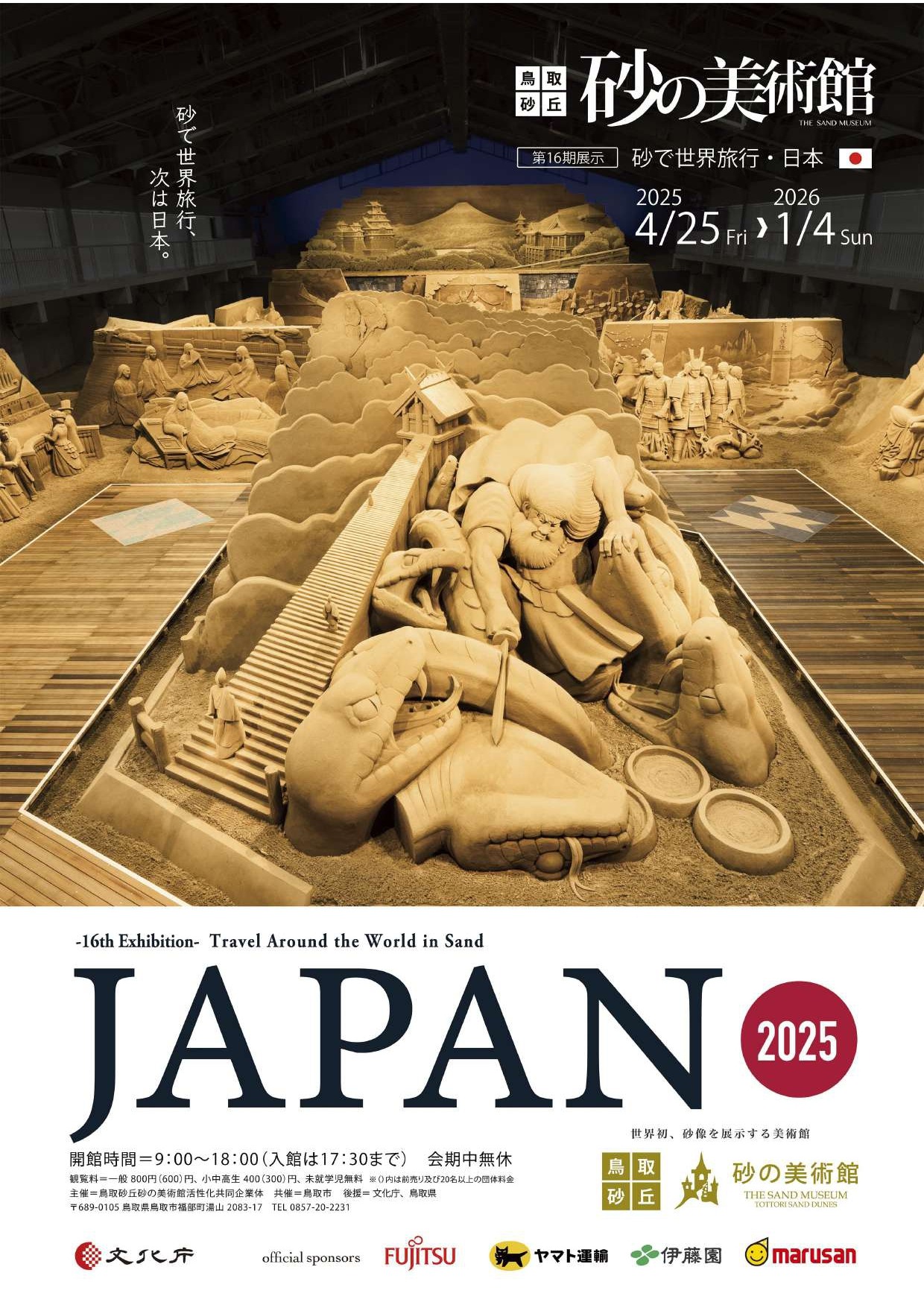 第16期は、日本で「2025年日本国際博覧会」が開催されることから「日本」テーマに選定されました。神話の時代から現代までの歴史をベースに富士山や京都に代表される景勝地、寺社建築や浮世絵などを題材にした砂像がならんでいます。