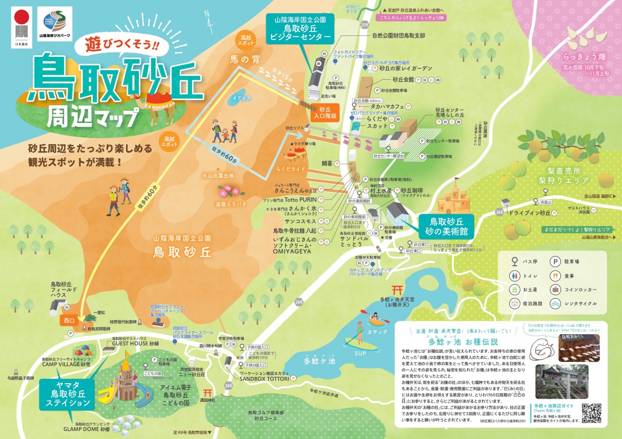 雄大な鳥取砂丘を間近にのぞむ大自然の中19ヘクタールの広い園内に、大型アスレチック遊具、水の遊び場、バッテリーカーなどののりもの、いろいろな工作ができる木工工房・砂の工房などがあります。