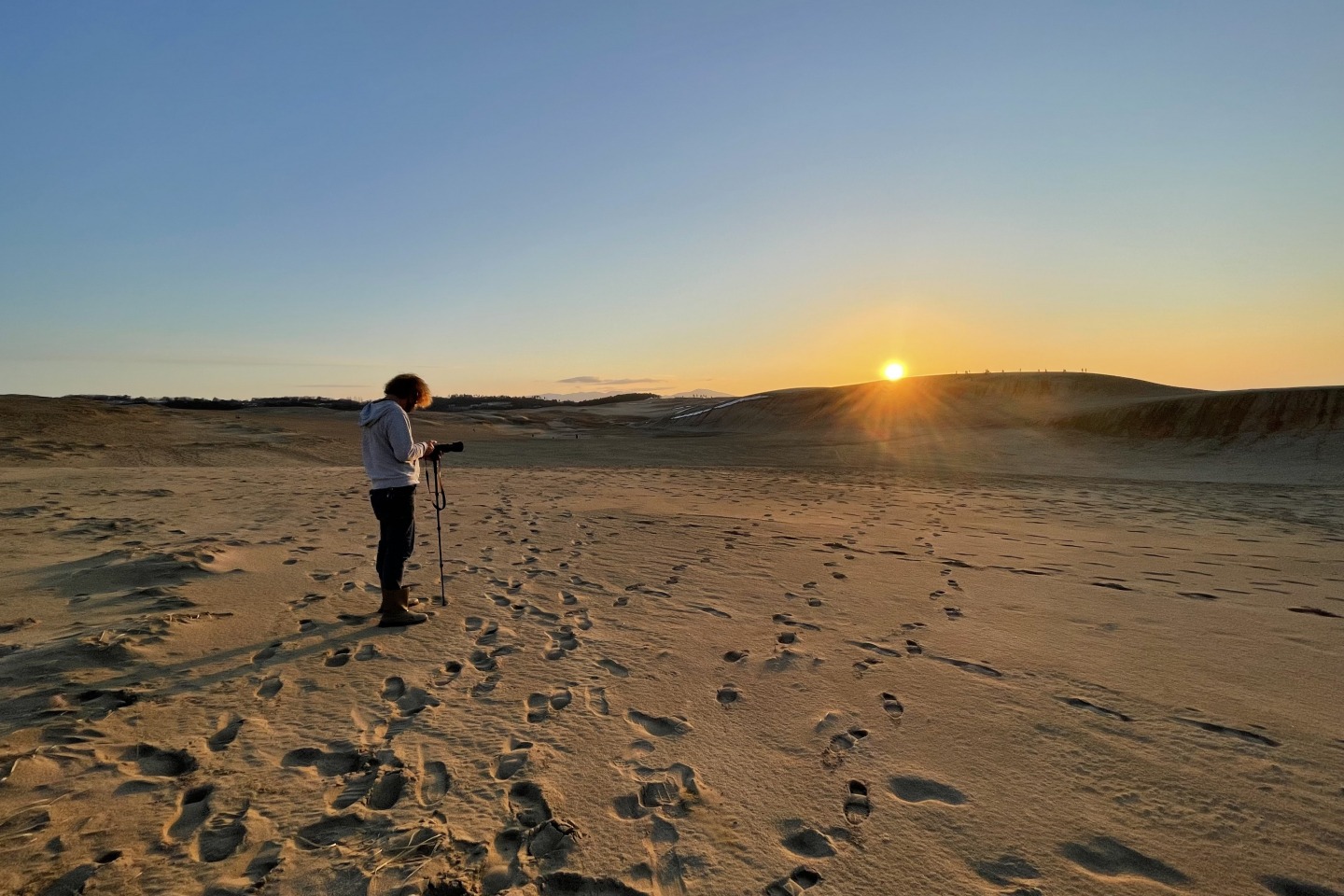 夕暮れ時に砂丘を訪れると,水平線近くに明るい照明が広がり,一瞬,向こう岸の街が見えているのかと錯覚してしまう。