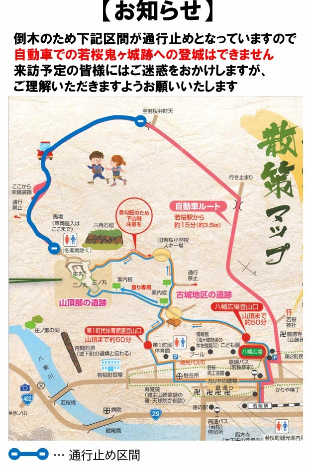 若桜鬼ヶ城跡までの自動車ルートは倒木のため通行止めとなっています。