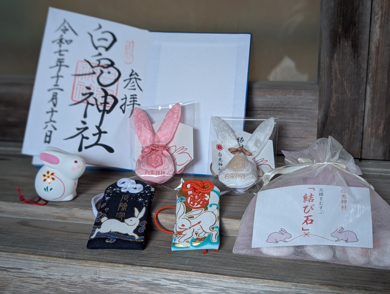 社務所には白うさぎをモチーフにした絵馬やお守りが並び、五つの石が入った「結び石」が有名です。願い事を込めて鳥居や白うさぎの石像にのせると願いが叶うと言われています。