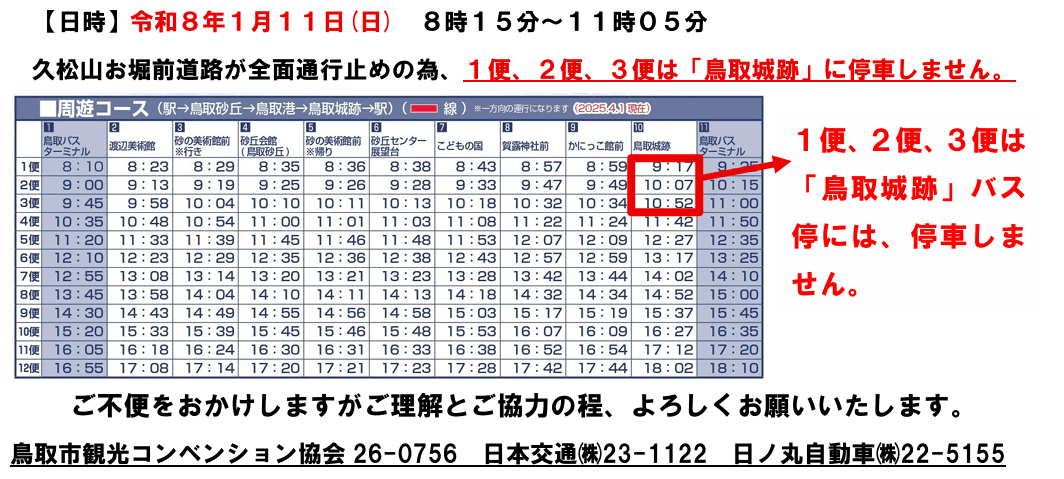 鳥取バスターミナル 8:10~9:45発の便(1便、2便、3便)は、「鳥取城跡」バス停には停車いたしません。