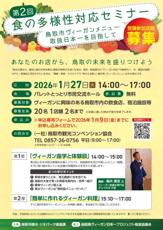 第2回「食の多様性対応セミナー」 ~鳥取市ヴィーガンメニュー取扱日本一を目指して~受講参加店舗募集!