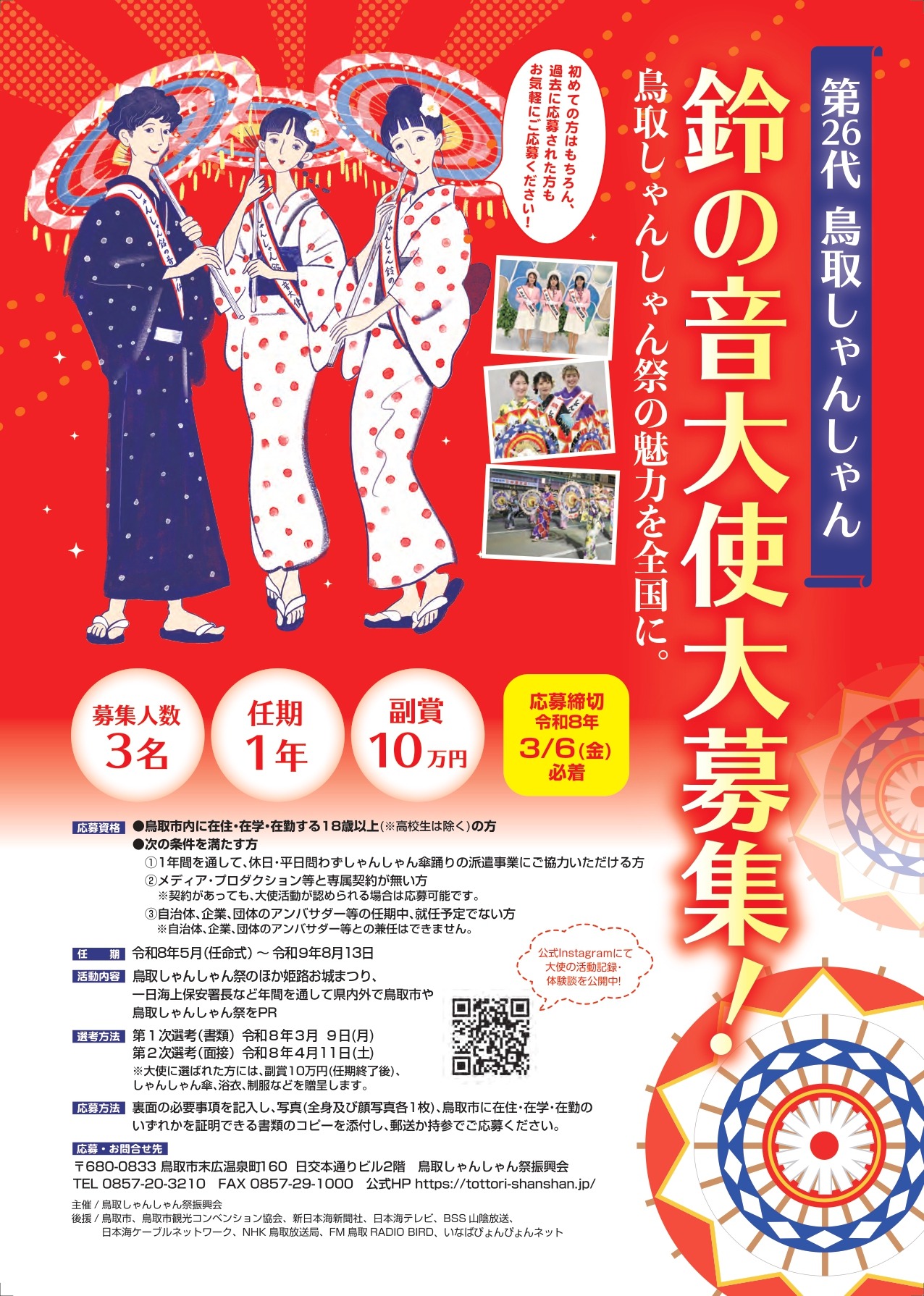 鳥取しゃんしゃん祭振興会では、現在「第26代鳥取しゃんしゃん鈴の音大使」を募集しています。