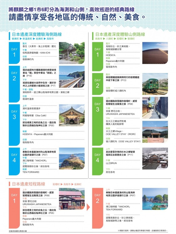 - 此步行旅程中可以充分體驗日本遺產「麒麟之鄉」、以及被认定为聯合國教科文組織世界地質公園的山陰海岸地質公園中的風景名勝「浦富海岸」。